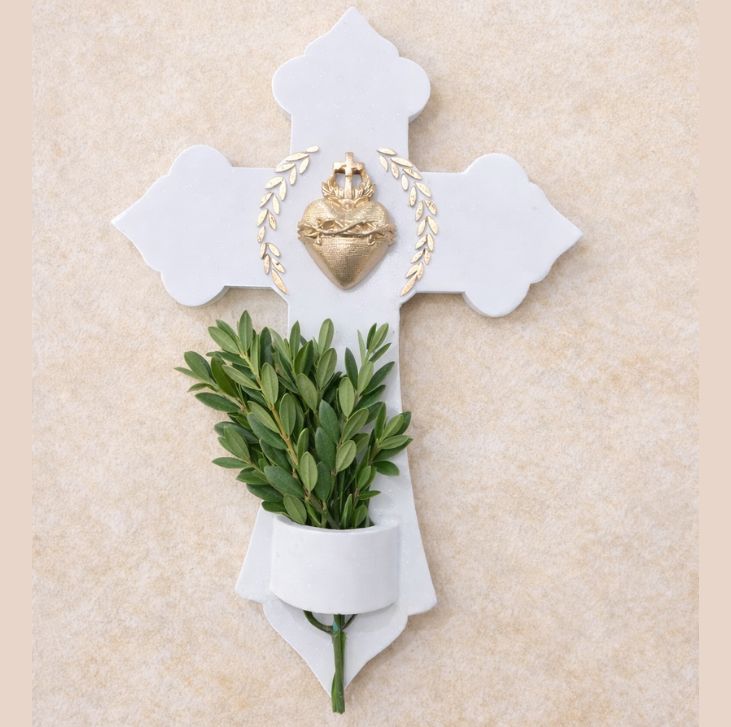 Sa forme délicate et harmonieuse en fait un objet à la fois spirituel et décoratif. Elle se distingue par une encoche discrète, permettant d’y déposer un rameau, une fleur ou un petit signe de prière, selon les temps liturgiques ou les moments de vie.